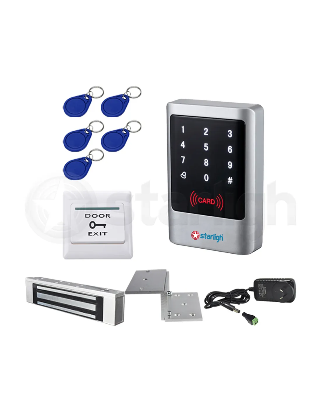 Kit completo de control de accesos, incluye: 1 control de accesos EC-CARDECOEXT-RL una cerradura electromagnética de 180kg, un soporte en Z para cerradura, una fuente para cerradura de 12v 2Ah, 5 tags de proximidad.